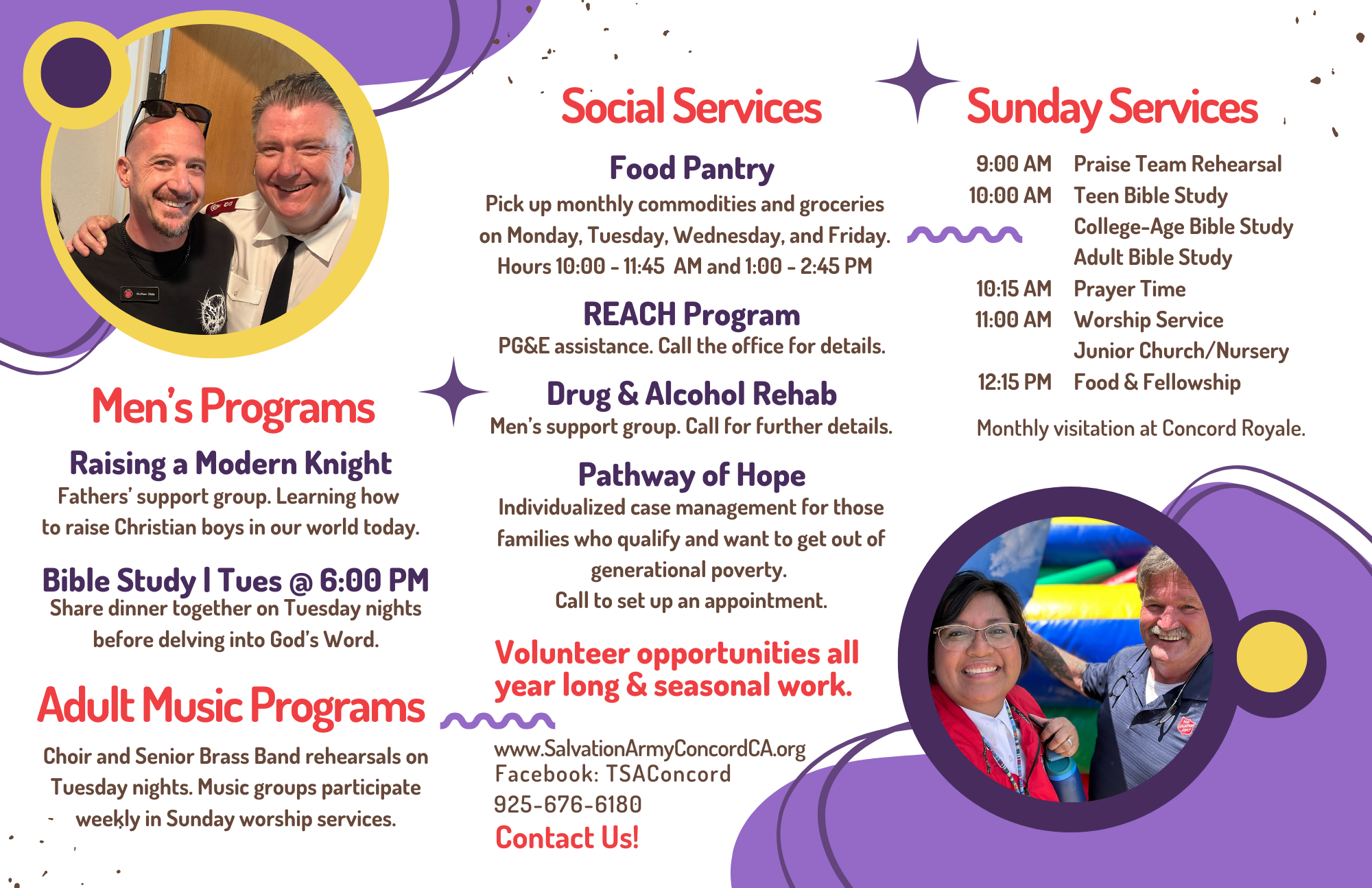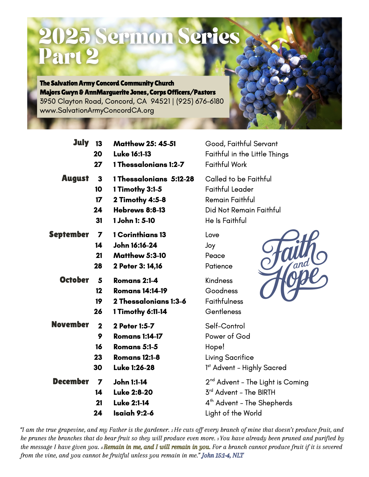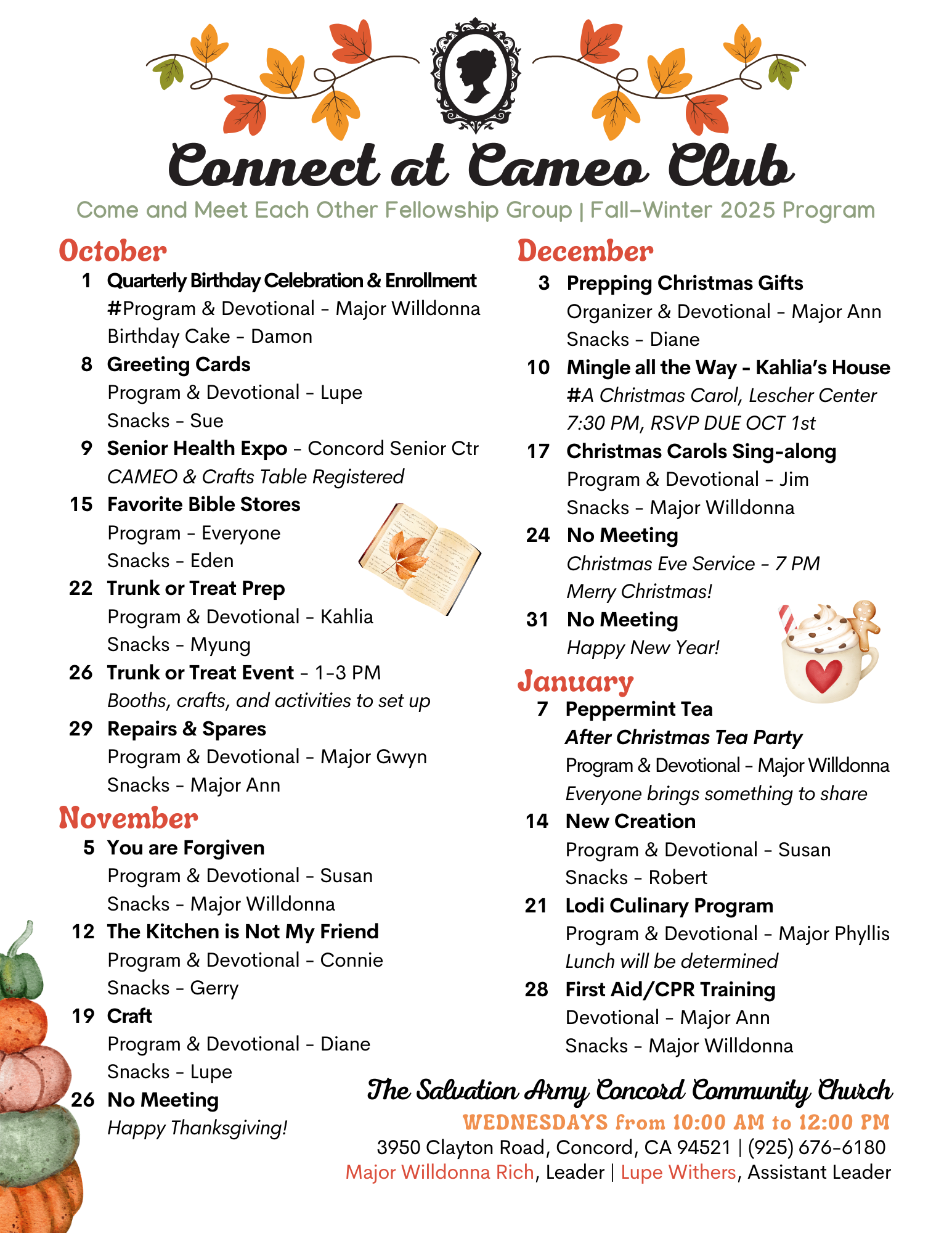 If you are coming to any of these fellowship opportunities for the first time, please check with the Church Office (925) 676-6180 for exact times as circumstances may change