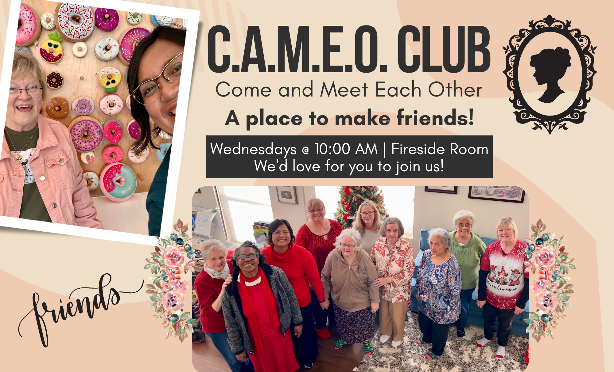 We have several programs providing fellowship and support for the women of our congregation and community. These include our CAMEO club, Women's Bible Study and small group fellowship. There are lots of activities included such as arts and crafts and educational and entertainment programs.